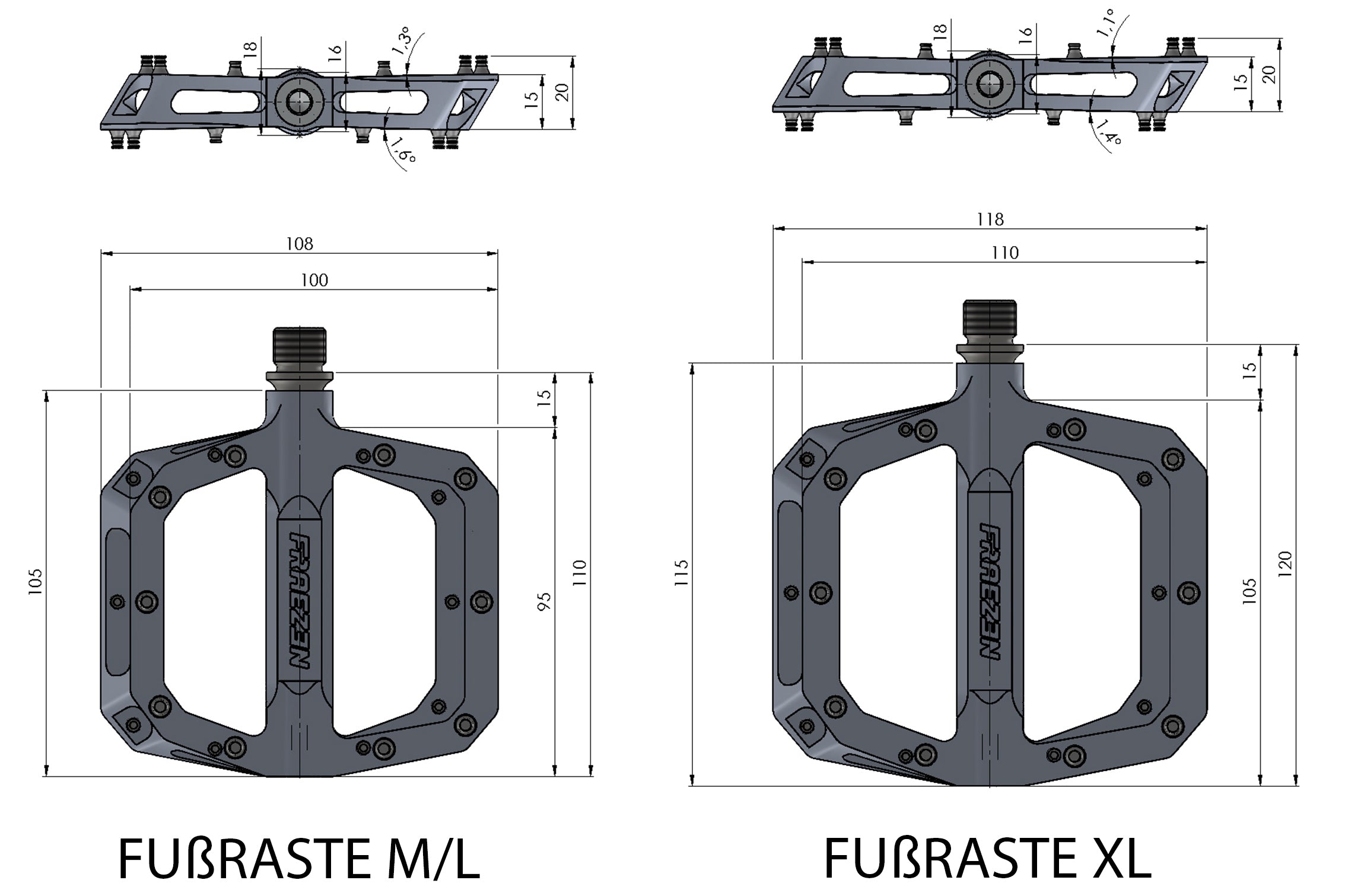 Wir empfehlen ab Schuhgröße 44 das XL Pedal. Je nach Präferenz kann man aber auch bei kleinen Füßen große und bei großen Füßen kleine Pedale fahren.